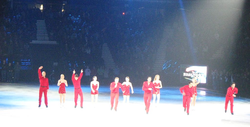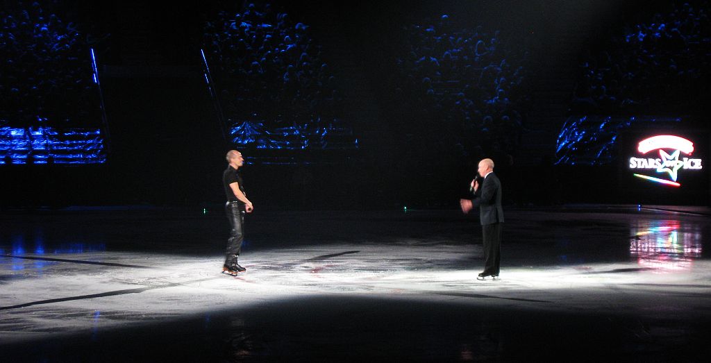 Here Kurt Browning on the left has just introduced Scott Hamilton on the right. There was deafening cheering and a standing ovation for Scott when he skated to center ice. He then took time to recall the past 25 years and the skaters whom we all remember.